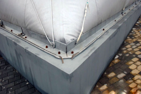 氣膜建筑膜體的下沿與基礎(chǔ)梁的連接,用專用的鋼質(zhì)夾具壓邊,用鏍栓連接到基礎(chǔ)梁中預(yù)埋的錨桿上,再將鋼纜穩(wěn)定(應(yīng)力控制)系統(tǒng)連接到錨桿上。