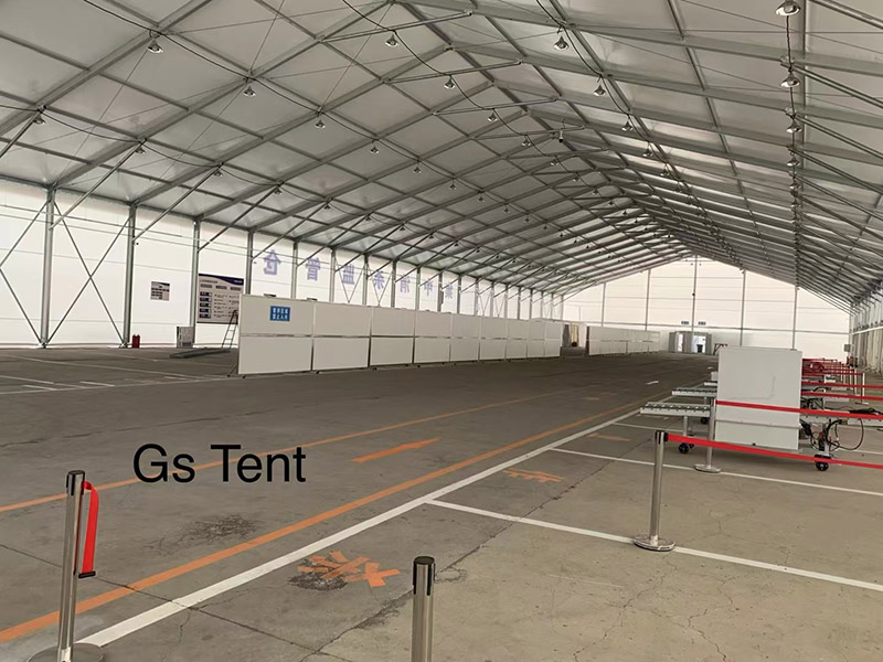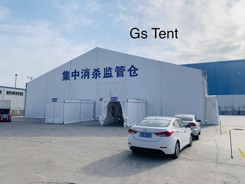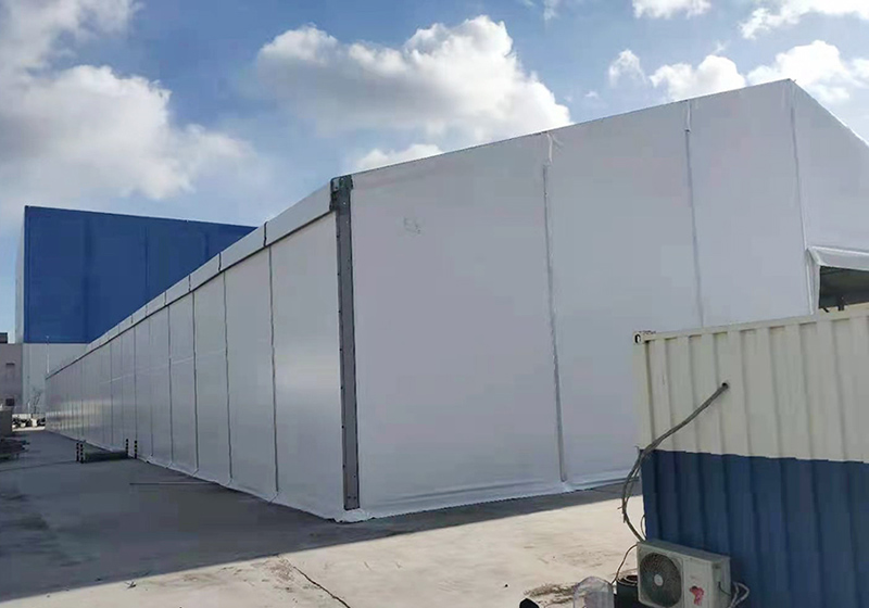 在本次大連冷鏈疫情中,高山篷房提供的2400平的裝配式物流倉(cāng)儲(chǔ)篷房、22座推拉篷房和6座更衣室篷房已正式投入使用。在抗擊疫情這種緊急時(shí)刻,去臨時(shí)修建傳統(tǒng)固定倉(cāng)庫(kù),時(shí)間上是不允許的,因此搭建快速、結(jié)構(gòu)安全的裝配式篷房就派上了用場(chǎng)。