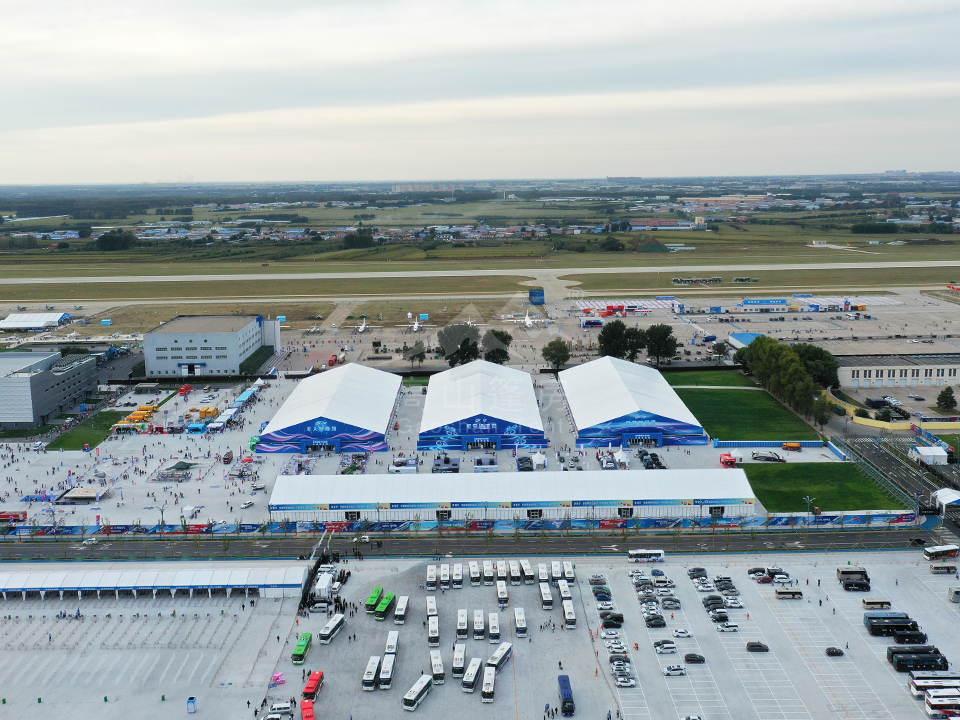 高山篷房憑借高強度鋁合金型材和阻燃雙面PVC篷布,為航展提供抗風、防水、防火、防紫外線的優良性能。