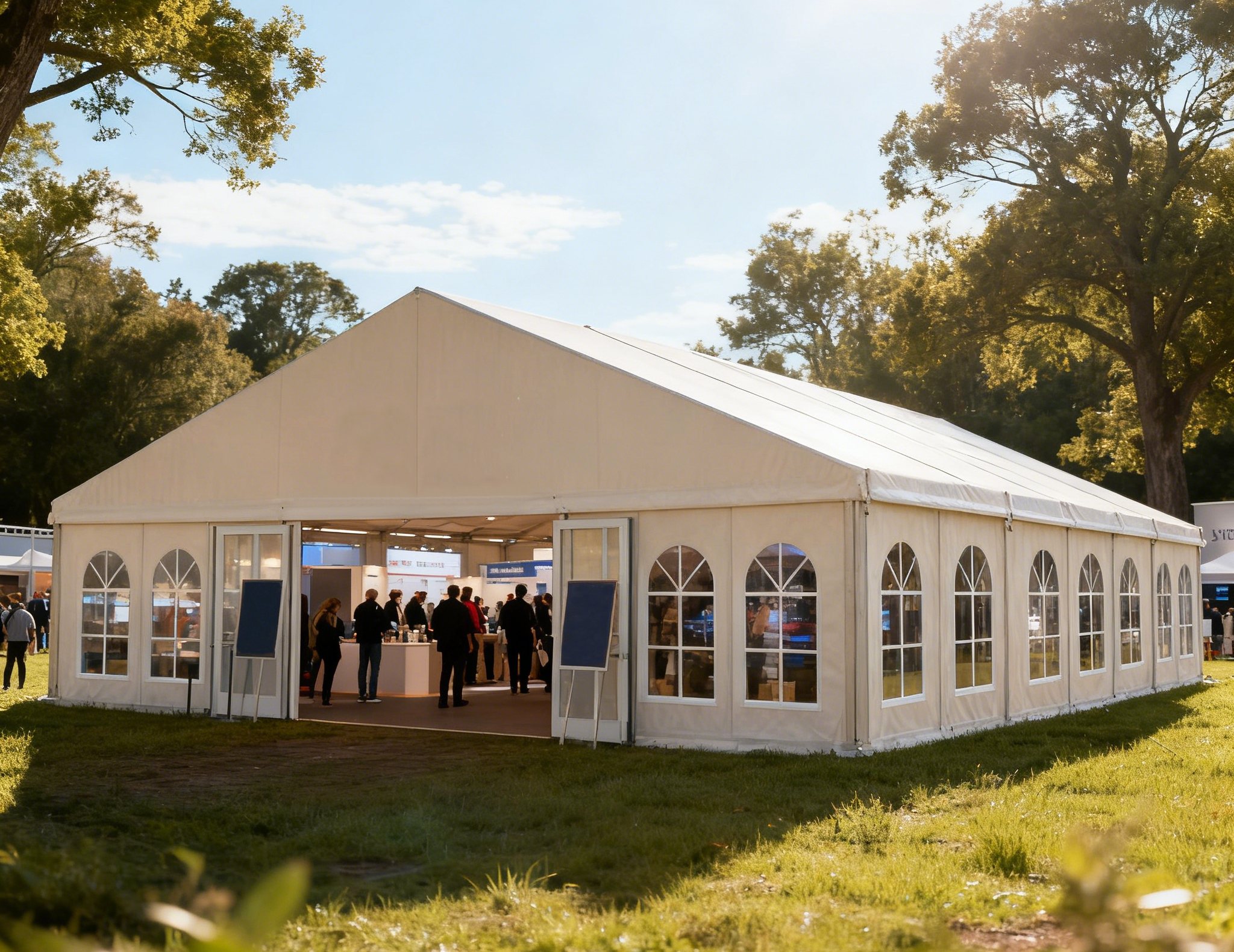 安全是空間的基石?,F代篷房采用高強度鋁合金主體框架與經過防火處理的PVC篷布,結構穩固,能有效抵御各種惡劣天氣。可根據需求靈活配置墻體(如硬質墻板、玻璃墻)、地板、空調系統、照明系統及智能安防設施,營造一個與永久建筑相媲美的安全、舒適、功能完備的室內環境。