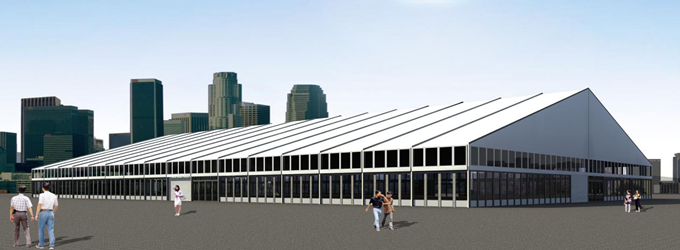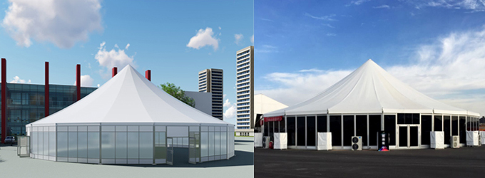 適合搭在較大地面上的多邊形篷房,造型別致,遠遠就能看見,且內(nèi)部空間寬敞,輕松裝下幾百個標準攤位,尤其適合北方地區(qū)的大型展銷會和集市。