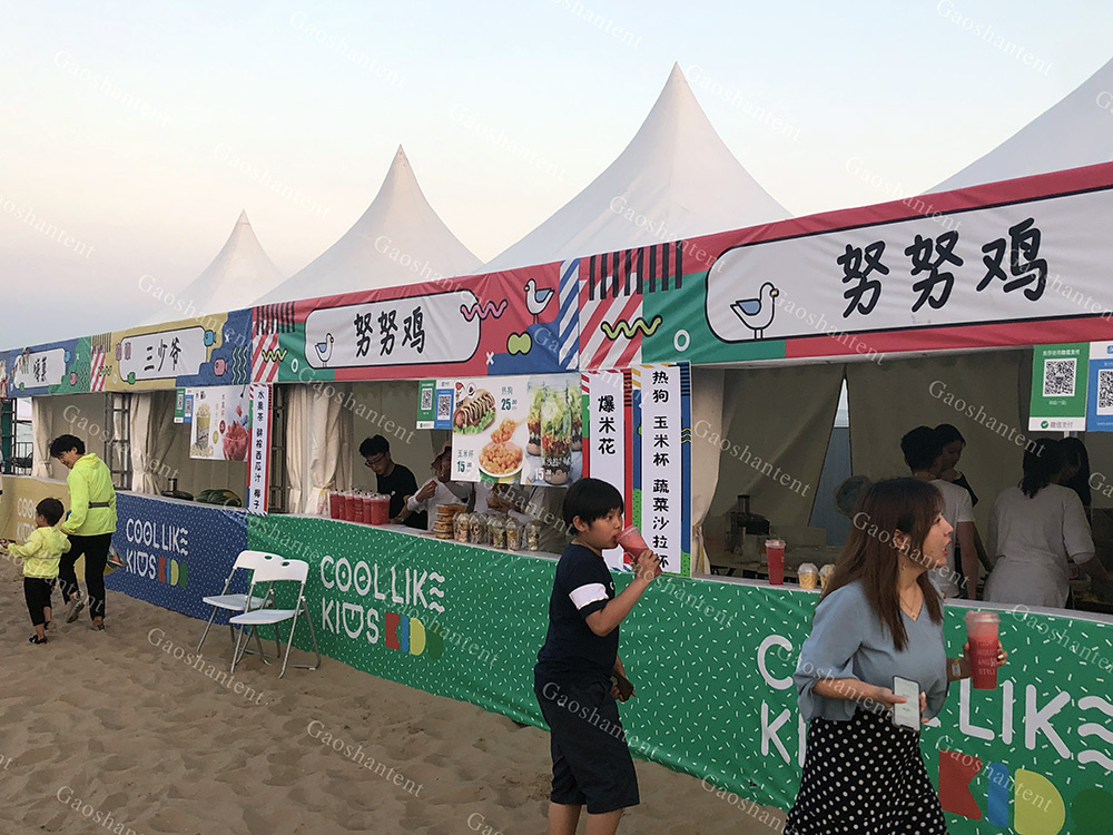 高山尖頂篷房除了單獨(dú)使用外,還可以將它用排水槽連接起來組成更大的面積,形成獨(dú)特的造型,在眾多戶外活動中更加出彩。